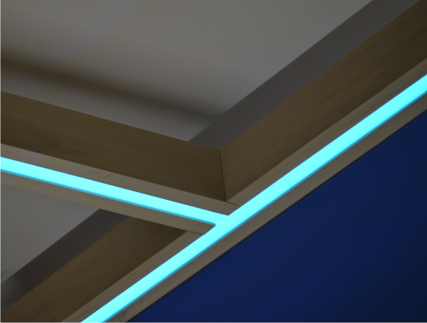 Plafond trellis DPL. C’est une structure de plafond de forme arbitraire, qui est définie par le concepteur (architecte, designer). Cette structure accrochée sur des suspensions se compose de poutres entrecroisées avec un éclairage LED linéaire intégré et comporte certaines cellules qui contiennent des Dalles.